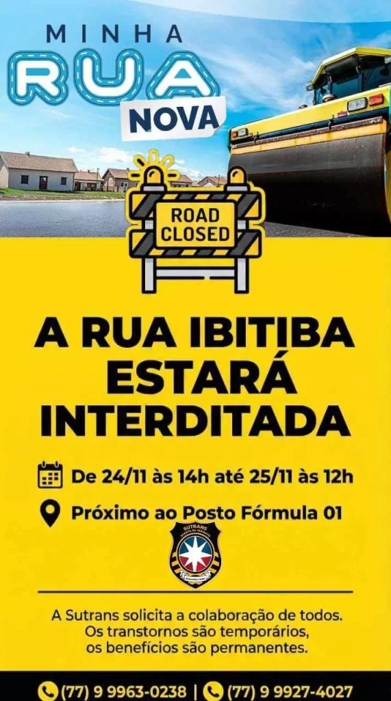 A Superintendência de Transporte e Trânsito (Sutrans) informa que, a partir das 14h do dia 24/11/2025 até às 12h do dia 25/11/2025, a Rua Ibitiba, nas proximidades do Posto Fórmula 01, estará interditada para montagem de estrutura e, posteriormente, para a realização do evento de lançamento de um importante programa da Prefeitura: Minha Rua Nova.