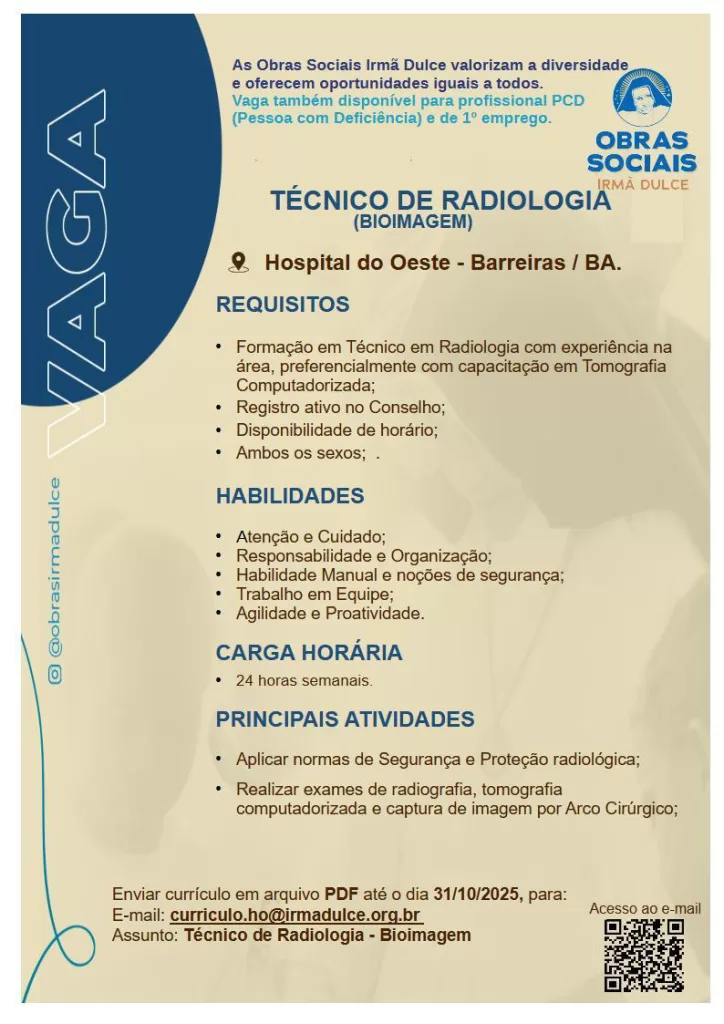 Para o setor de bioimagem o currículo deve ser enviado até 31/10 e para radioterapia o prazo é até 03/11. E-mail para contato; curriculo.ho@irmadulce.org.br