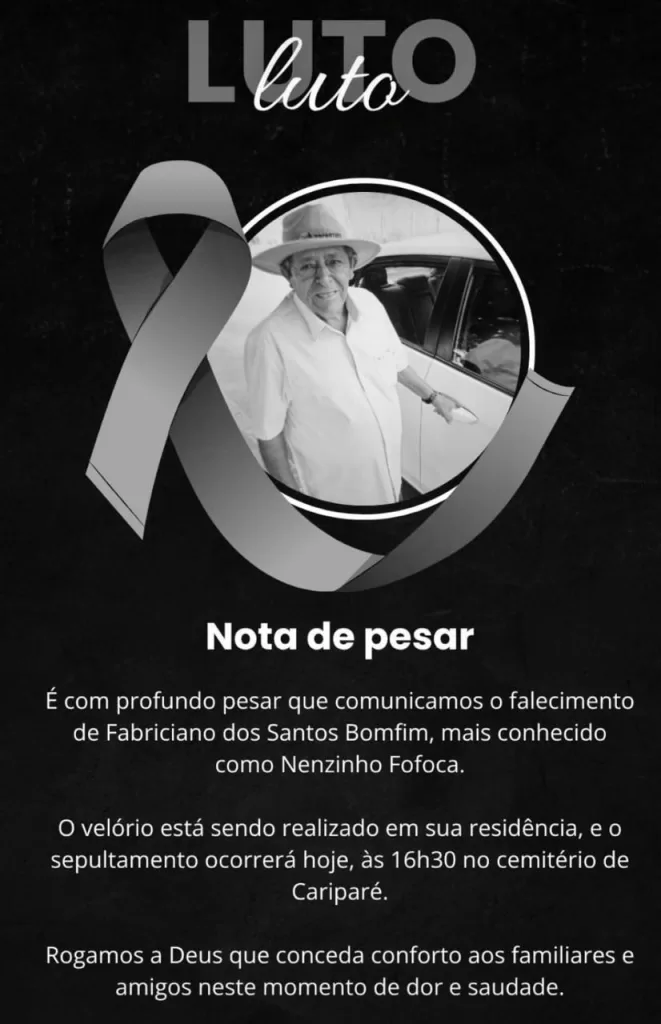 É com profundo pesar que comunicamos o falecimento de Fabriciano dos Santos Bomfim, carinhosamente conhecido como Nenzinho Fofoca, ocorrido na sexta-feira, 7 de novembro de 2025.