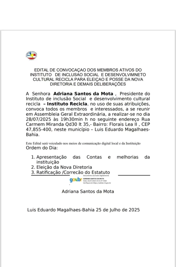 “Atenção, monitores e acompanhantes! A Prefeitura de Luís Eduardo Magalhães, por meio da Secretaria Municipal de Educação, convocou 278 profissionais para apresentação de documentação nos dias 10, 11 e 14 de julho. Horários: 8h às 11h30 e 14h às 17h. Local: Sede da Secretaria de Educação (Rua Valdemar Klein, 129, Jardim Imperial).” 📝