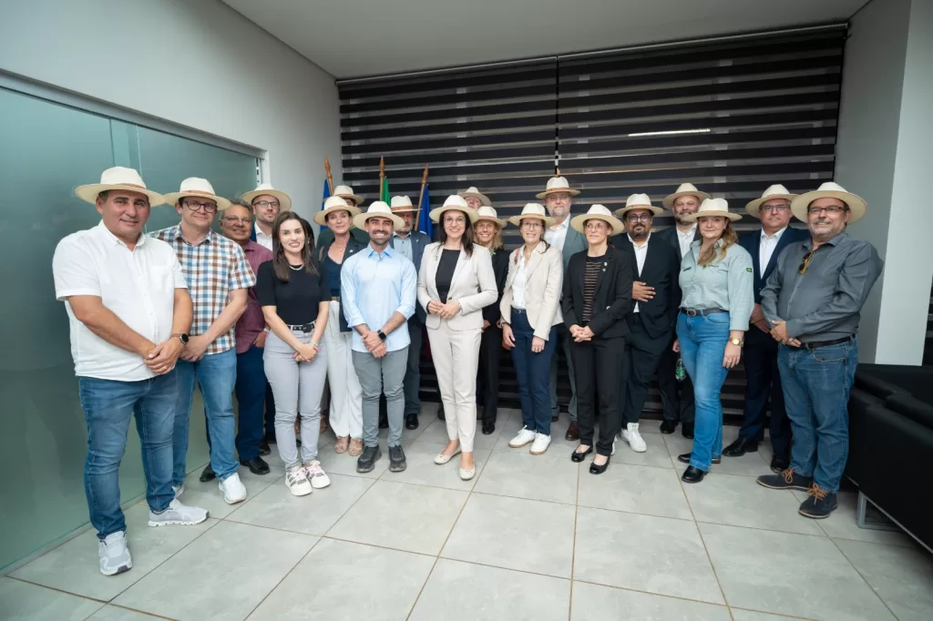 O prefeito de Luís Eduardo Magalhães, Junior Marabá, a secretária de Estado Parlamentar do Ministério da Agricultura, Alimentação e Identidade Regional da Alemanha, Sra. Martina Englhardt-Kopf. Acompanhados da primeira-dama e secretária da Cidadania, Cinthya Borges, do vice-prefeito, Franklin Willer, do secretário de Sustentabilidade, Kenni Henke e demais integrantes da delegação alemã.