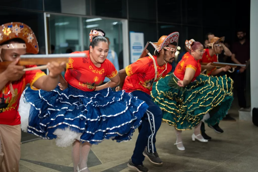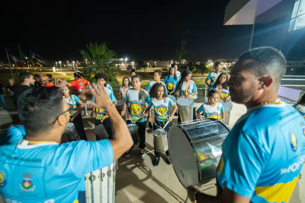 Músicos do grupo percussivo Batida VivaIntegrantes da Junina Cai, Mas Não Cai durante apresentação