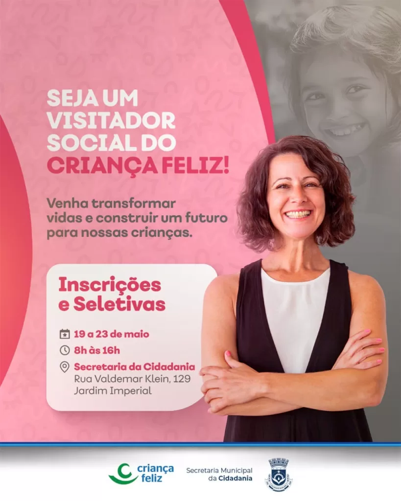 A Prefeitura de Luís Eduardo Magalhães, por meio da Secretaria Municipal da Cidadania, abriu inscrições para o processo seletivo de visitadores do Programa Criança Feliz. O período de inscrição será de 19 a 23 de maio de 2025, das 8h às 16h, na sede da Secretaria, localizada na Rua Valdemar Klein, nº 129, bairro Imperial.