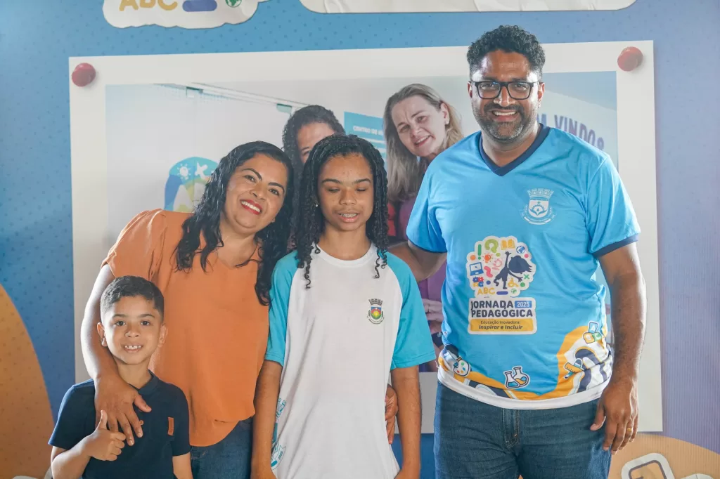 O secretário municipal de Educação, Jefferson Café com Kiara e família durante a Jornada Pedagógica 2025