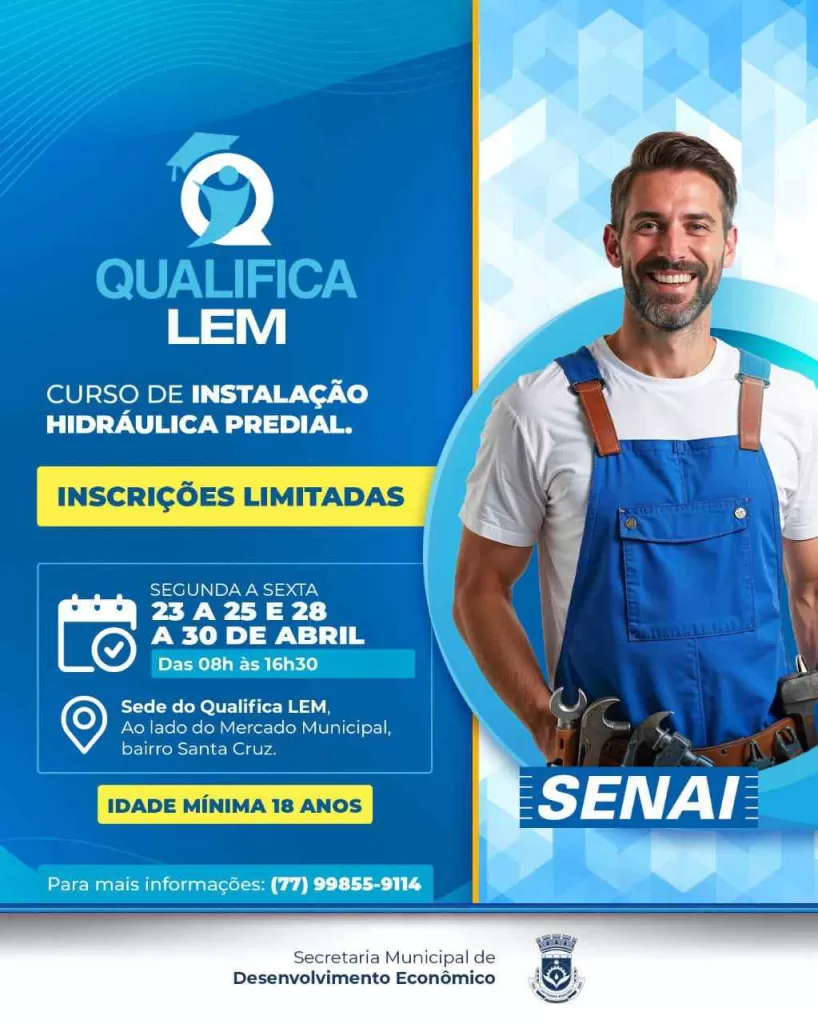 Estão abertas as inscrições para os cursos gratuitos de Eletricista de Instalações Prediais e Instalação Hidráulica Predial , até o dia 30 de abril ou enquanto houver vagas. A iniciativa faz parte do Programa Qualifica LEM, uma parceria entre a Prefeitura de Luís Eduardo Magalhães, por meio da Secretaria Municipal de Desenvolvimento Econômico e o Senai.