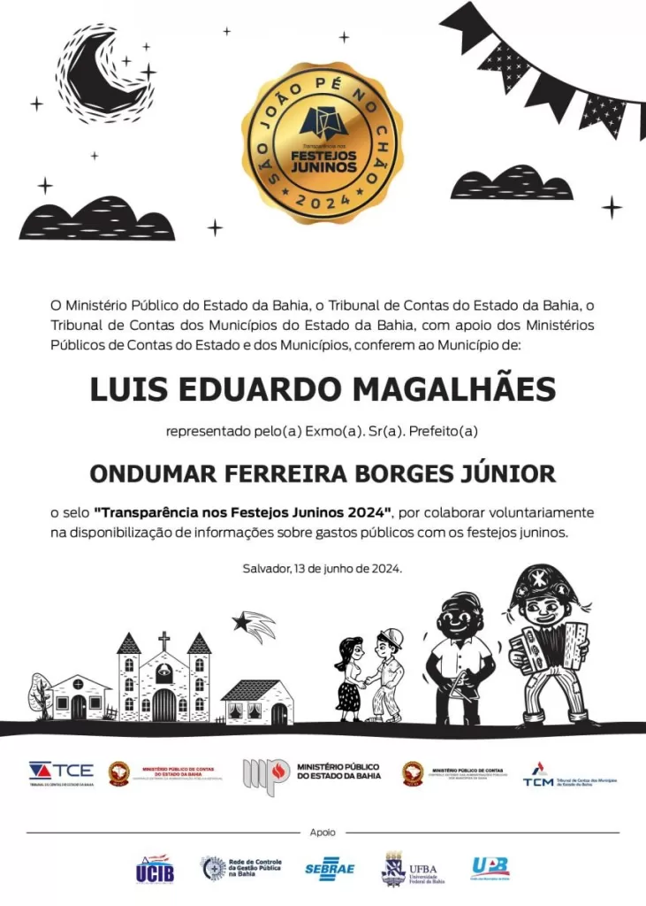 O Arraiá de LEM, que será realizado de 28 de junho a 02 de julho, na Avenida Tancredo Neves, em frente ao Mercado Municipal, no bairro Santa Cruz, em Luís Eduardo Magalhães, recebeu pelo segundo ano consecutivo, o selo Transparência Pública do Ministério Público da Bahia (MPBA), que recebe o nome de ‘São João Pé no Chão’.