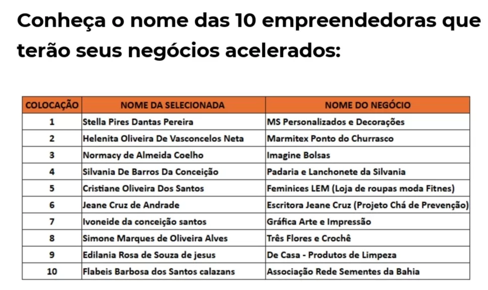 Na ocasião, foram conhecidas as 10 empreendedoras que foram selecionadas para seguir para a terceira fase do programa (Aceleração) e que receberão até R$ 10 mil de aporte financeiro como capital semente para investirem nos seus negócios. Nos próximos cinco meses, essas mulheres contarão com o acompanhamento de consultoras especialistas que irão apoiá-las na construção e execução dos planos de negócios.